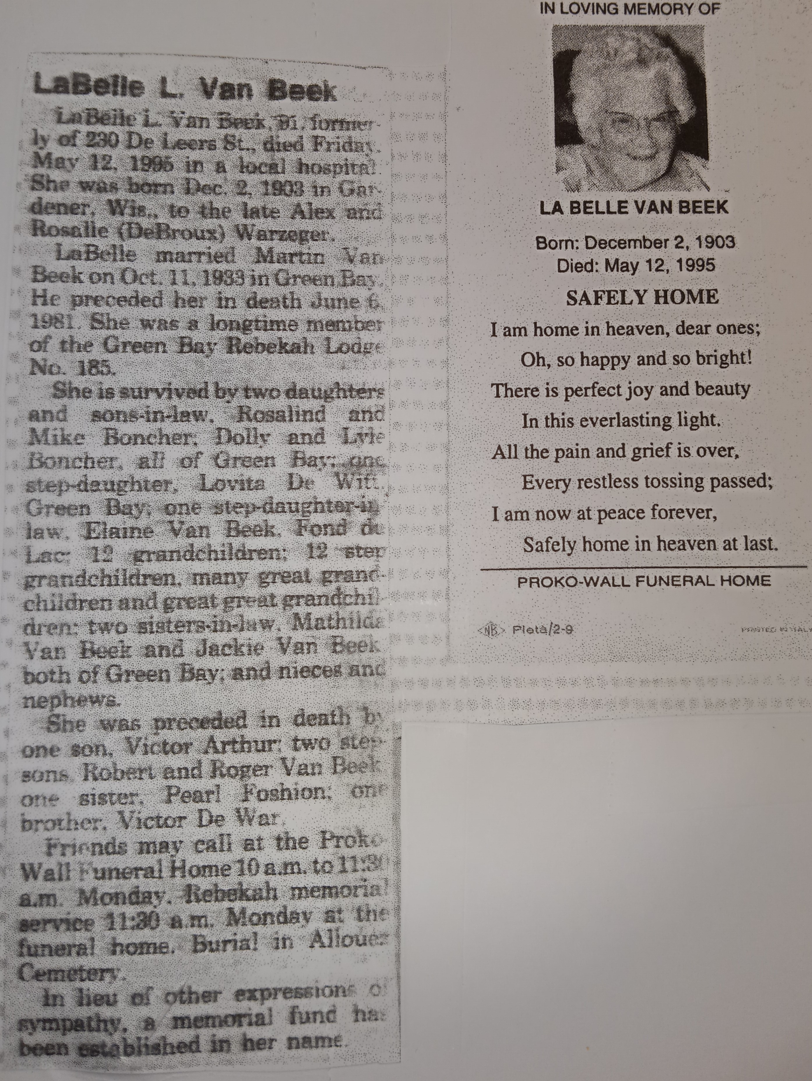 | Green Bay - Dolly Jewel Boncher, 93, and Lyle John Boncher, 92, of Green Bay, passed away on Monday, April 5, 2021. Dolly was born on December 4, 1927, in Green Bay. She is the daughter of the late Martin and LaBelle (Arthur) VanBeek. Lyle was born on September 30, 1928, in the Town of Holland (Kaukauna). He is the son of Thomas and Genevieve (Leurquin) Boncher.