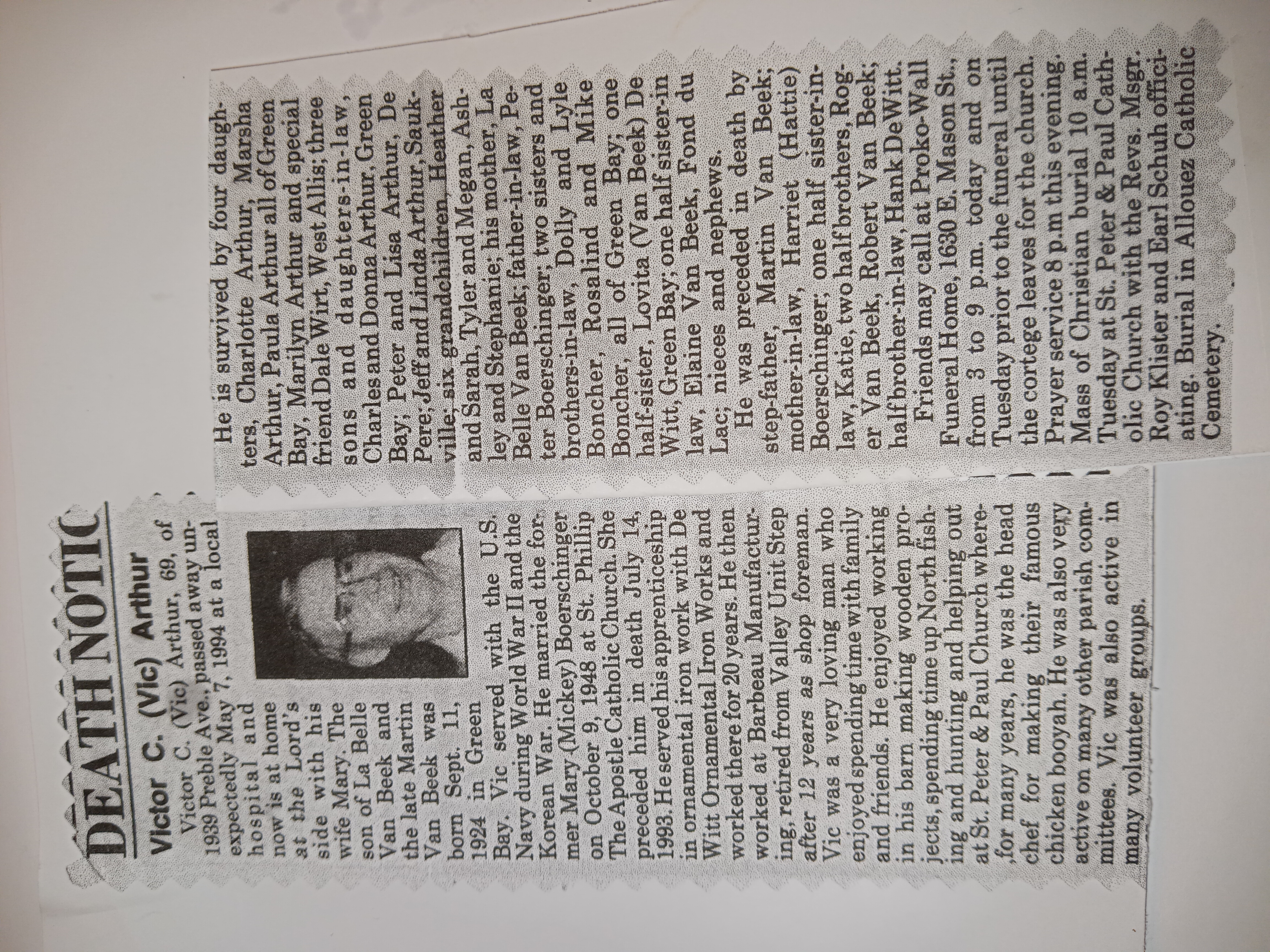 He spent his youth living, working, and playing in Manawa. He had a paper route which he took over from his older brother, Lloyd and often used his horse, Peanut, to deliver papers. He also had a popcorn stand in the alley way by Paters restaurant, which he acquired from Vic Baldwin. He also worked for his father at Lloyd's Midtown Bar and on the farms that they owned north of Manawa. When he wasn't working, he could be found swimming, diving off the powerhouse roof by the dam. He attended Little Wolf schools in Manawa, playing basketball and football. He was on championship teams in both sports. He was a life-long member of Sacred Heart Catholic Church where he was baptized, served mass, took his first communion and confirmed. His Catholic faith was important to him until his death.